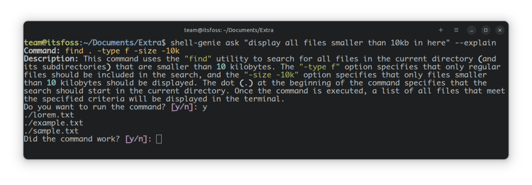 由于人工智能的进步,这实际上是可能的。下面是自动生成 Linux 命令以显示当前目录中所有小于 10 KB 的文件的示例。