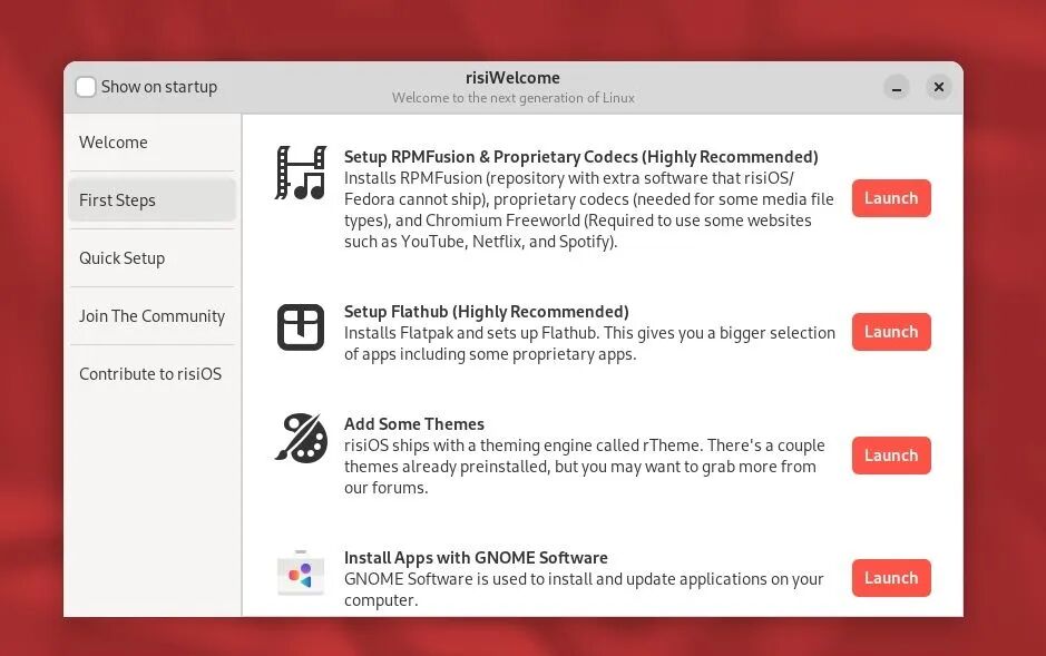 例如,你会看到一个带有 risiOS 的欢迎屏幕,通知你基本的 安装 Fedora 后应该做的事情🔗 itsfoss.com。不仅仅是信息,它还有助于在首次安装 Fedora 后自动执行一些重要的第一步。