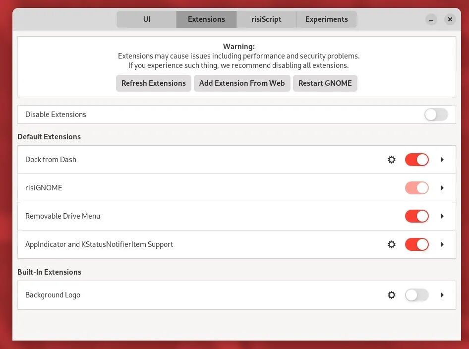 正如你所注意到的,risiOS 内置了一些 GNOME 扩展🔗 itsfoss.com。你可以在此处使用相同的应用禁用或配置它们。