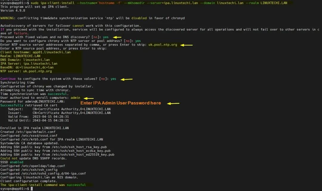 $ sudo ipa-client-install --hostname=`hostname -f` --mkhomedir --server=ipa.linuxtechi.lan --domain linuxtechi.lan --realm LINUXTECHI.LAN