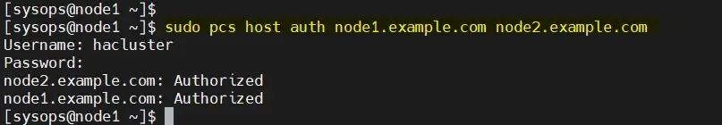 使用 pcs 命令对两个节点进行身份验证,从任何节点运行以下命令。在我的例子中,我在 node1 上运行它: