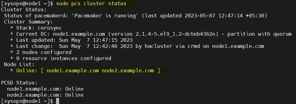 $ sudo pcs cluster setup http_cluster --start node1.example.com node2.example.com