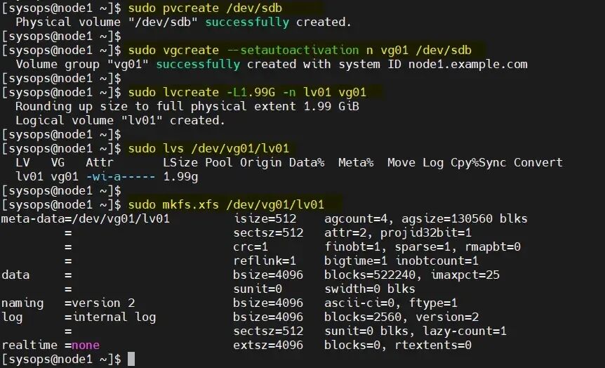 在服务器上,挂载了一个大小为 2GB 的共享磁盘(/dev/sdb)。因此,我们将其配置为 LVM 卷并将其格式化为 XFS 文件系统。