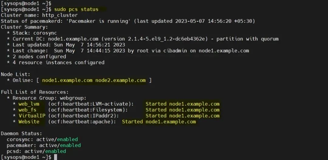 很好,上面的输出显示所有资源都在 node1 上启动。