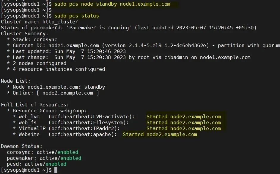 让我们尝试将集群资源从 node1 移动到 node2,运行: