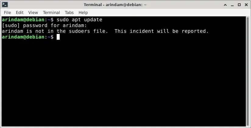 在安装 Debian Linux 的过程中,如果你将 root 帐户的密码保留为空,那么系统中的 创建的第一个用户🔗 www.debian.org 将拥有管理权限。但是,如果你设置了 root 密码,那么用户名将不具有 sudo 权限。因此,在使用用户帐户执行管理任务时,你可能会遇到以下类似的错误。
