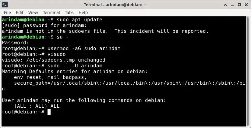 要验证用户是否已成功添加到 SUDOERS 组,你可以打开一个新的终端窗口并输入以下命令。将 arindam 替换为你添加到 SUDOERS 组的用户的实际用户名。
