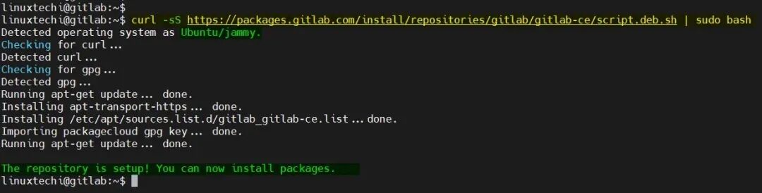现在,我们将添加 GitLab 仓库,运行以下 curl 命令。它将自动检测你的 Ubuntu 版本并相应地设置仓库。
