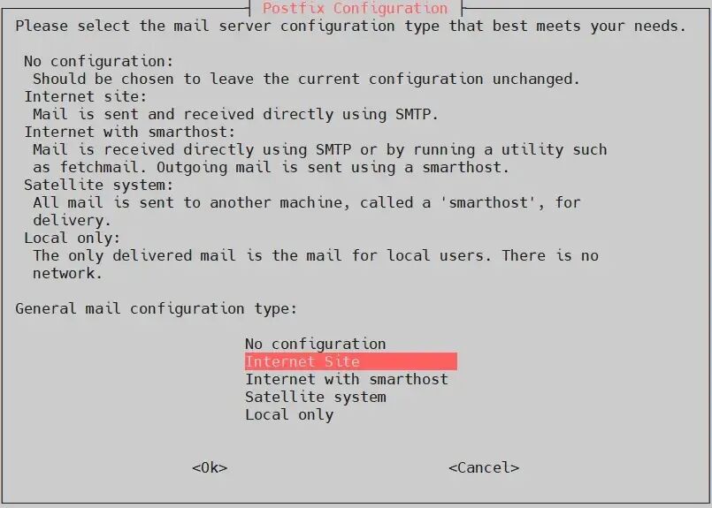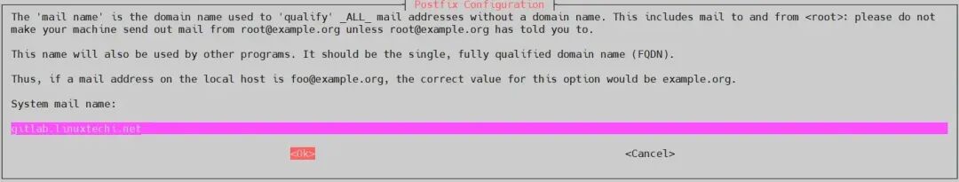 在 postfix 安装过程中,会出现一个配置窗口。选择 “Internet Site”并输入服务器的主机名作为邮件服务器名称。这将允许 GitLab 发送电子邮件通知。