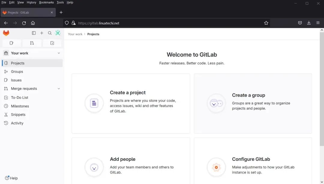 成功执行上述命令后,你的 GitLab 界面应该可以通过 HTTPS 协议访问,在我的例子中,URL 为:https://gitlab.linuxtechi.net/