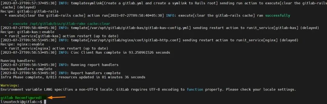 保存并退出文件,使用下面的命令重新配置 gitlab,以便其 Web 界面可以使用 HTTPS。