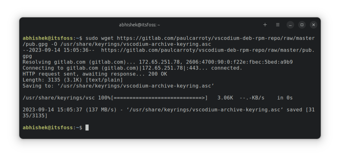 sudo wget https://gitlab.com/paulcarroty/vscodium-deb-rpm-repo/raw/master/pub.gpg -O /usr/share/keyrings/vscodium-archive-keyring.asc