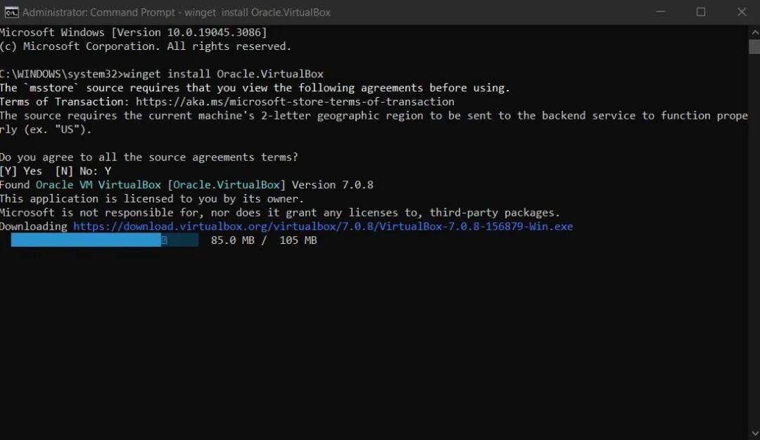 接下来,你需要使用 winget 命令来安装 VirtualBox。