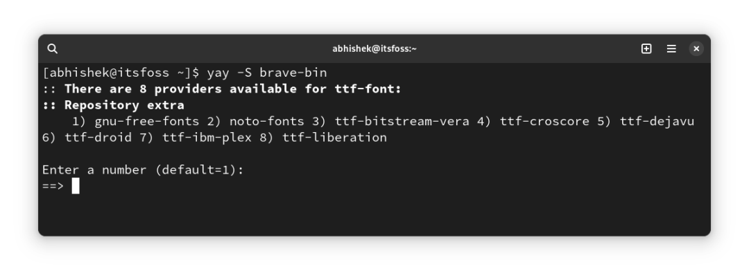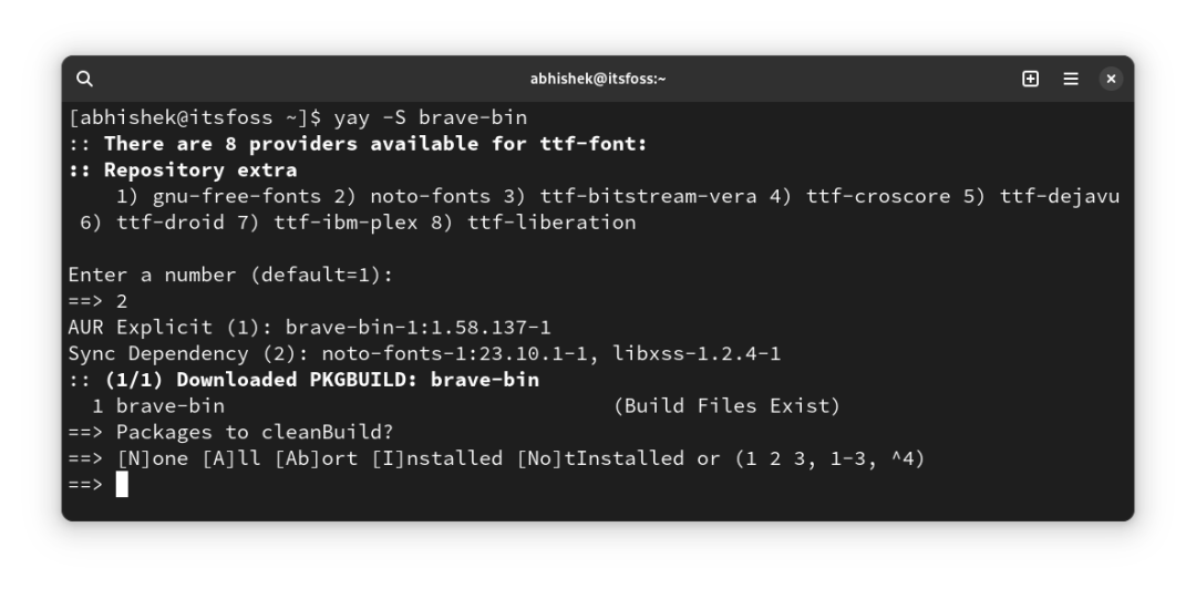 如果你安装了 Yay(或任何其他 AUR 帮助程序),那么安装 Brave 就像使用以下命令一样简单: