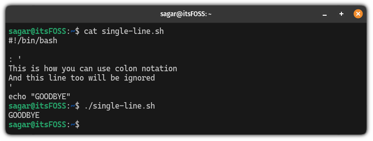 当你想说明 Bash 脚本的行为方式时这不错。如果你正在调试 Bash 脚本并希望隐藏部分脚本,则在所需代码的每一行开头添加 # 并在调试后将其删除是一项耗时的任务。
