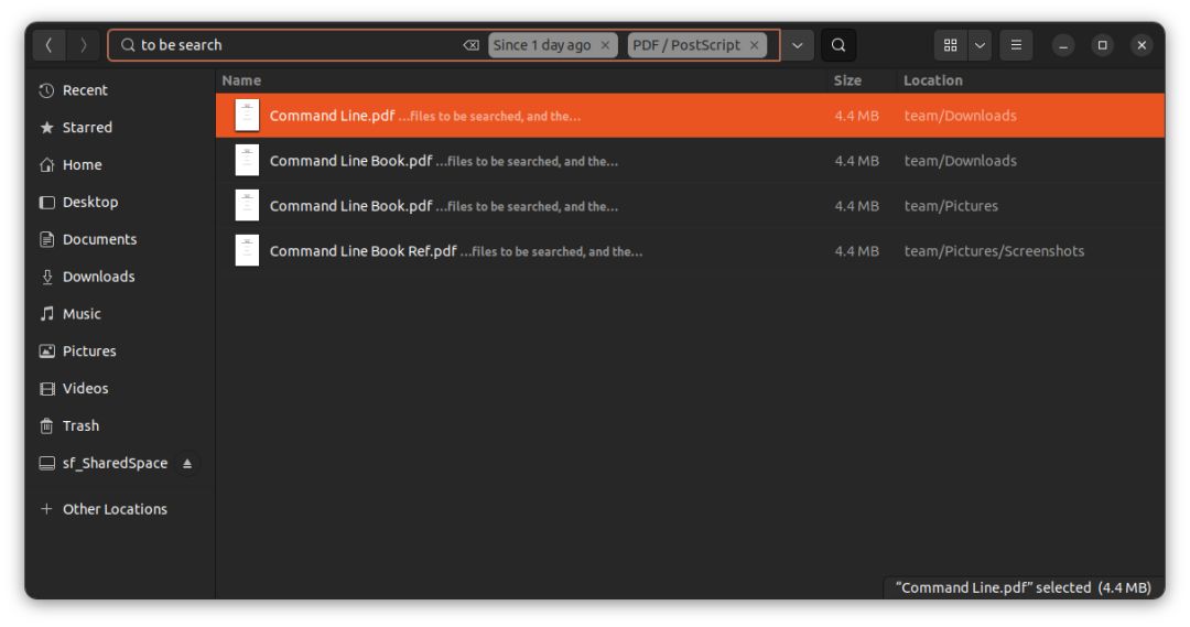 你可以在下面的截图中看到,我已经搜索了包含字符串 “to be search” 的文件。我应用的标准是 1 天内创建的 PDF 文件。