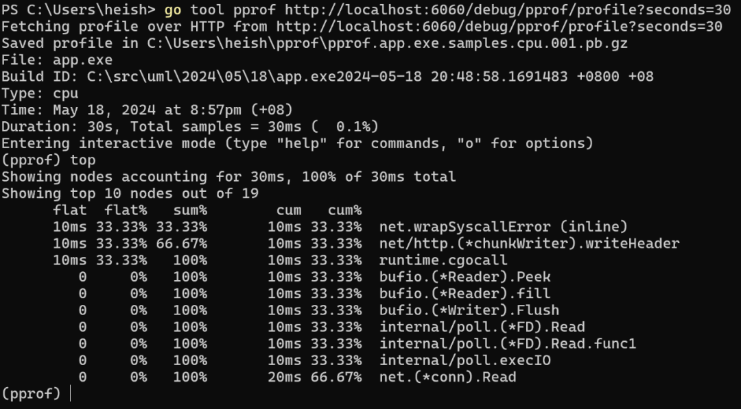 go tool pprof http://localhost:6060/debug/pprof/profile?seconds=30