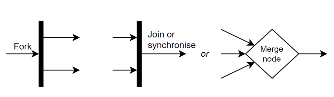 在图中,我们可以看到两个并行节点(Fork和Join),分别用于订单处理和财务处理的并行操作。Fork节点用于将一个活动流分成多个并行流,如图中的“准备发货”和“发送发票”是并行进行的。Join节点则用于将多个并行流合并成一个,如图中的“接受付款”后合并到订单的关闭流程。