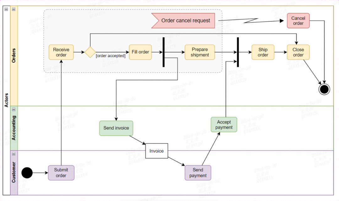 我们将分析上图中的活动图,该图展示了一个订单处理系统的业务流程。图中的主要元素和流程如下: