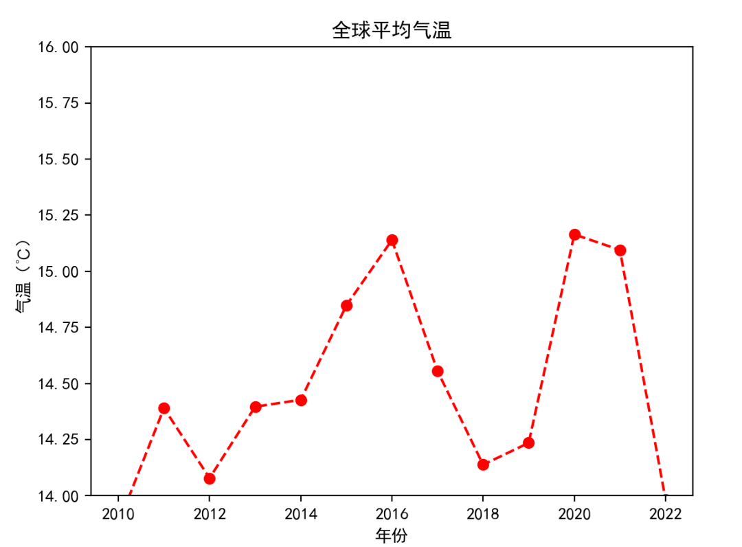import matplotlib.pyplot as pltimport numpy as np# Create some datayears = np.arange(2010, 2021)temps = np.random.normal(loc=15, scale=0.5, size=len(years))# Create a line plotplt.plot(years, temps, color='red', linestyle='--', marker='o')# Add title and labelsplt.title('全球平均气温')plt.xlabel('年份')plt.ylabel('气温(℃)')# Adjust the axis rangeplt.ylim(14, 16)# Show the plotplt.show()