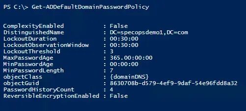 这个命令将返回有关Active Directory默认域密码策略的详细信息,包括密码的复杂性要求、密码最短/最长使用期限、密码历史记录长度等等。