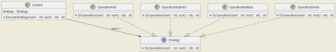 type Context struct { strategy Strategy}func NewContext(strategy Strategy) *Context { return &Context{ strategy: strategy, }}func (c *Context) ExecuteStrategy(num1 int, num2 int) int { return c.strategy.DoOperation(num1, num2)}