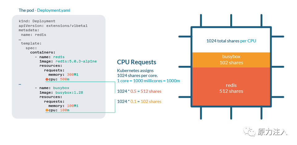 request 值不仅仅影响 Kubernetes 的调度,也会影响进程在 CPU 上的调度。