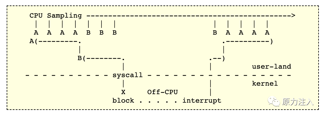系统分析器很少使用 Off-CPU 的采样。采样通常作为每个 CPU 计时器中断来实现,然后检查当前正在运行的被中断的进程:生成 CPU 上的配置文件。脱离 CPU 的采样器必须以不同的方式工作:要么在每个应用程序线程中设置计时器以唤醒它们并捕获堆栈,要么让内核按一定时间间隔遍历所有线程并捕获它们的堆栈。