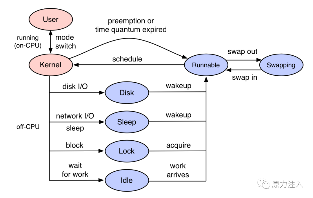 On-CPU 相对来讲比较好理解,而 Off-CPU 分析是一种性能方法,其中测量和研究 Off-CPU 时间以及堆栈跟踪等上下文。它与 On-CPU 分析不同,后者仅检查线程是否在 CPU 上执行。这里,目标是被阻塞和脱离 CPU 的线程状态,如上图中蓝色所示。