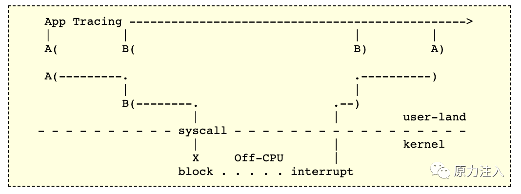 Off-CPU 分析与 On-CPU 分析是互补的,因此可以了解 100% 的线程时间。此方法还不同于跟踪通常阻塞的应用程序功能的跟踪技术,因为此方法针对的是内核调度程序的阻塞概念,这是一种方便的包罗万象的方法。