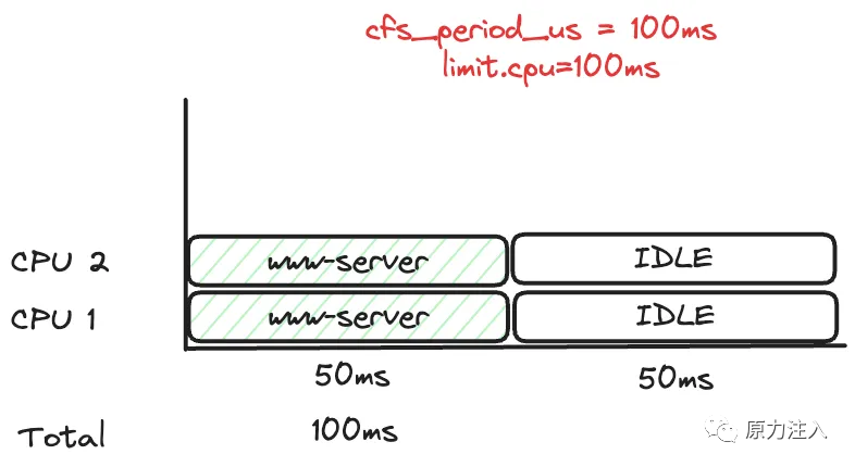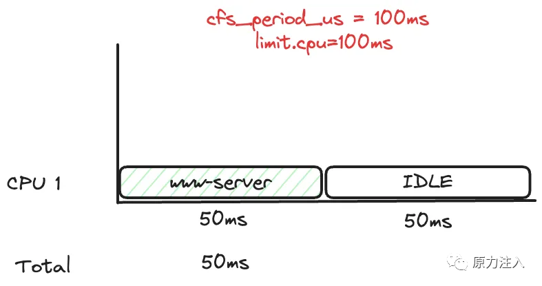 考虑部署一个限制为 100 毫秒的应用程序,但其 CPU 工作负载只需要 50 毫秒即可完成:
