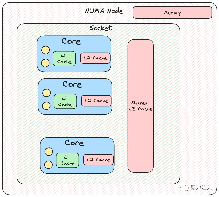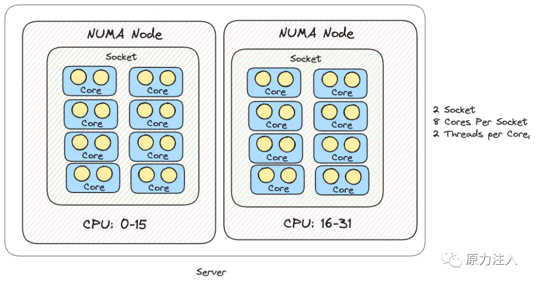 除了上面提到的概念之外,现在还有一种架构称为 NUMA(非统一内存访问)。NUMA将整个服务器划分为多个NUMA节点,每个节点都有多个核心(物理CPU)。节点共享相同的内存控制器。所以,如果核心之间存在内存相关的访问需求,那么在同一个NUMA节点内速度会是最快的,而跨NUMA节点时可能会有一些性能损失。