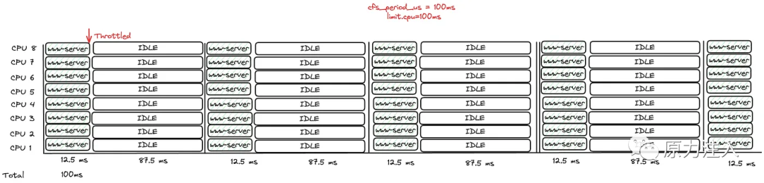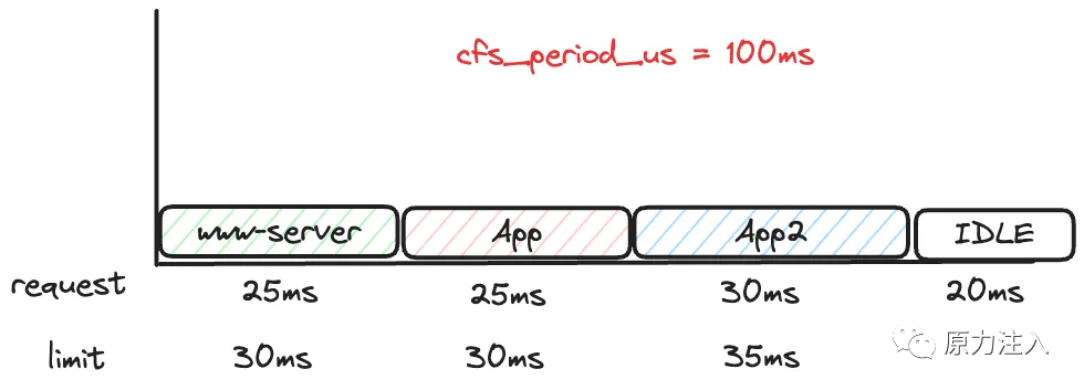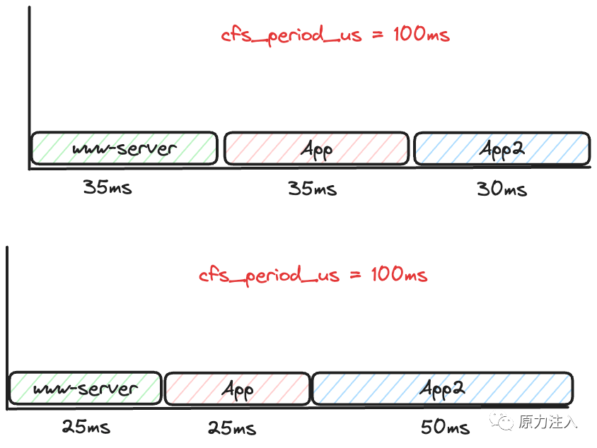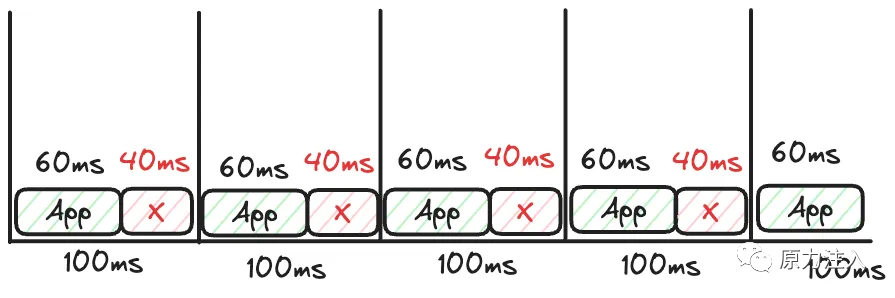 然而,CPU 操作并不是以 1 秒(1000ms)为单位发生的。CFS 运行期间,每次运行的时间由 cgroup 参数cfs_period_us决定,默认为 100ms。