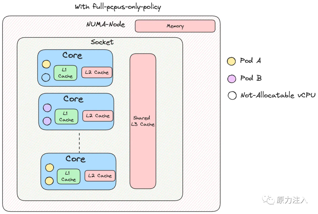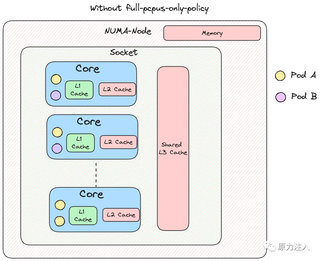 例如,在没有full-pcpus-only的场景中,虽然vCPU是独占保留的,但每个Core上可能运行不同的容器。由于业务不同,L1/L2 Cache可能会出现Cache Miss。