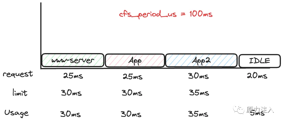 最终,CPU 将有 5 毫秒的空闲时间,因为所有三个应用程序都被限制了,没有多余的容量来继续运行。