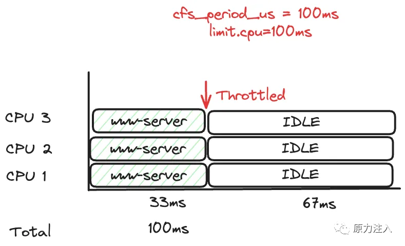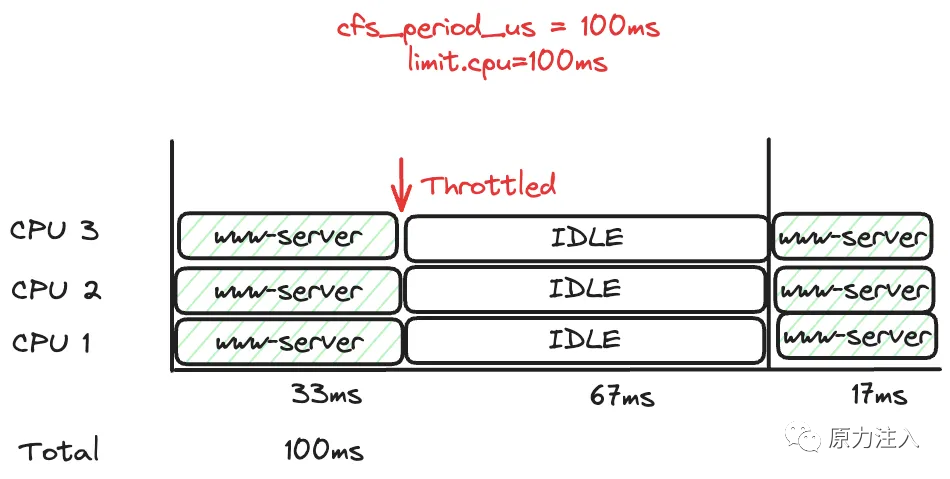 由于总量只有100ms,三个线程竞争,每个线程平均只能使用33ms。这就会触发节流机制,每个线程在剩余空闲时间(67ms)内无法做任何事情。