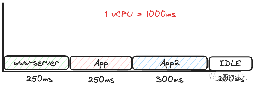 假设一致认为 1 个 vCPU 等于 1000ms,则使用情况可以如下可视化: