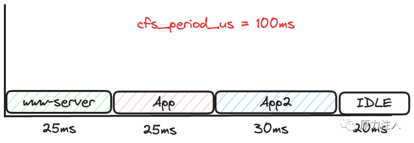 25 毫秒、25 毫秒、30 毫秒。然后剩下的 20ms 由它们竞争获得。因此,在实践中,各种组合都是可能的,例如: