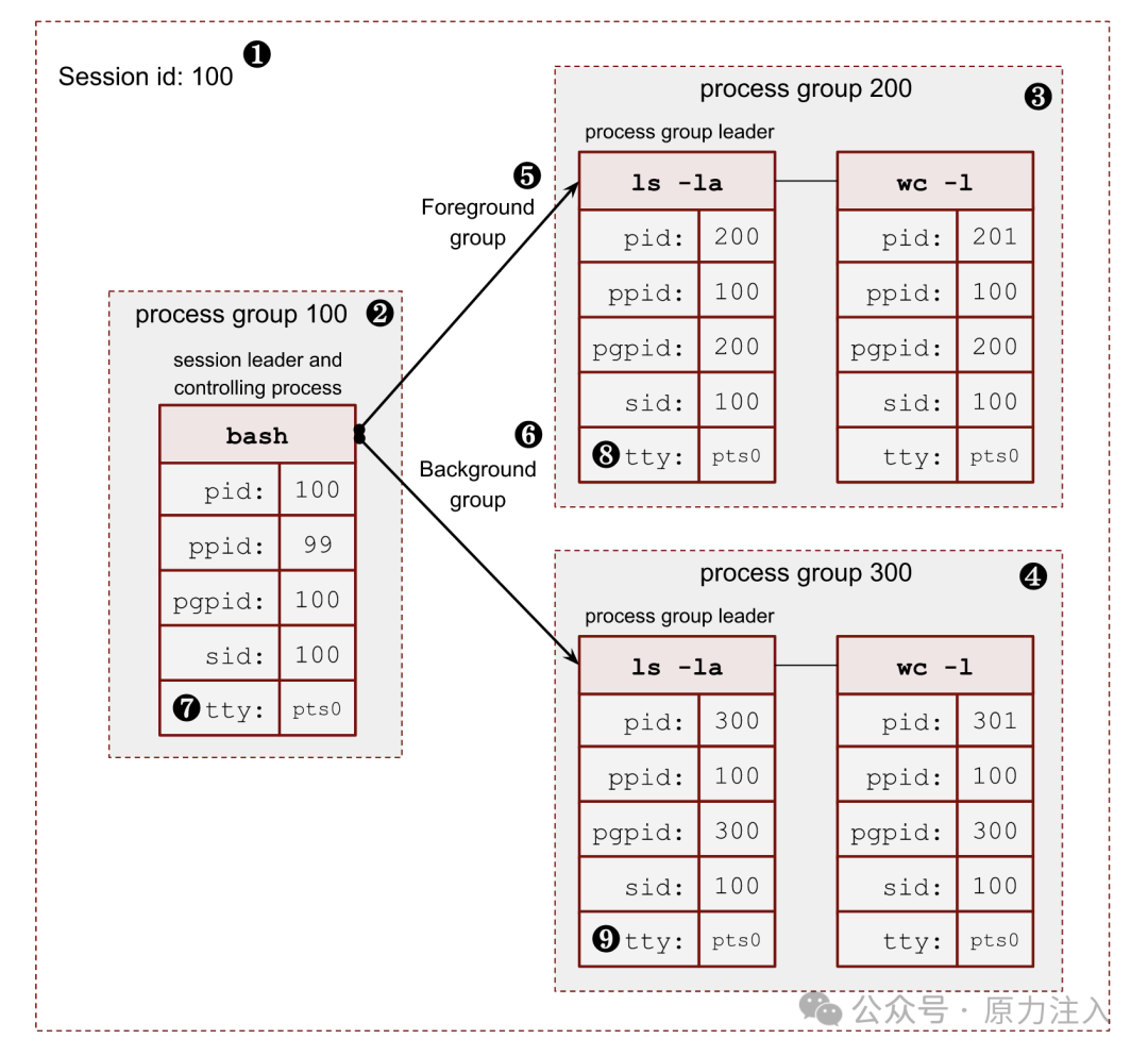 ❸、❹ – 会话还有 2 个进程组,分别为PGIDs 200 和 300。