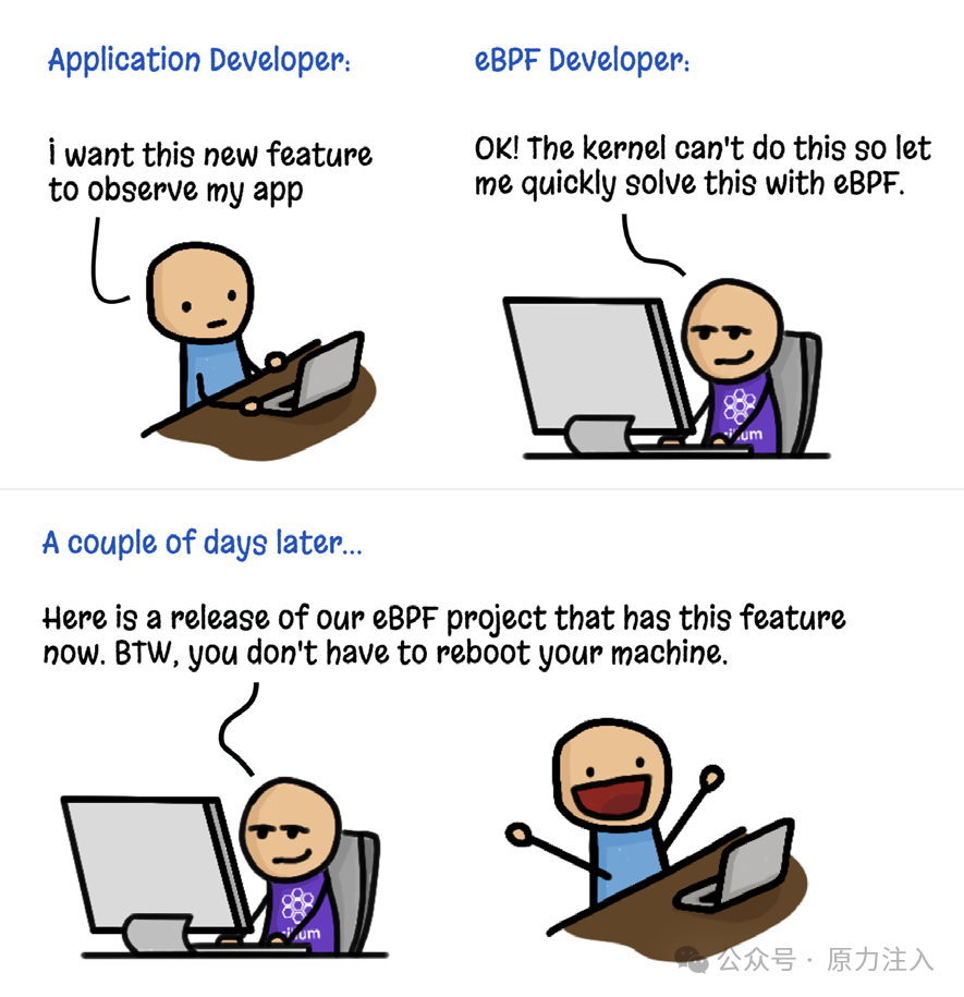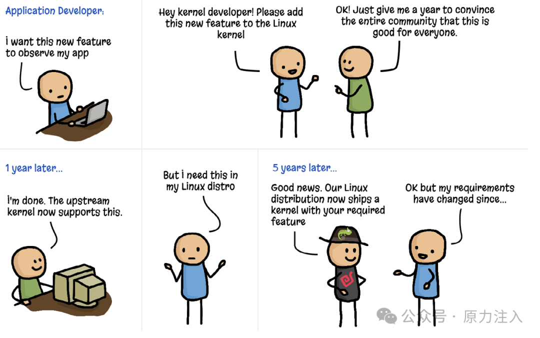 (eBPF的拥护者认为)毫无疑问,eBPF 将成为新的云原生基础设施堆栈中的新的一层,影响所有应用的可观测性、性能、可靠性、网络和安全性。平台工程师将 eBPF 能力融入到基础设施中以创建平台,然后开发人员可以在其上部署软件,添加业务逻辑,并替换无法跟上当今数字化和日益云原生化世界中老化的 Linux 内核(发展太慢)。