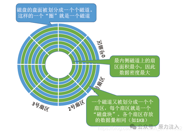 每个盘片被划分为一个个磁道,每个磁道又划分为一个个扇区。如下图: