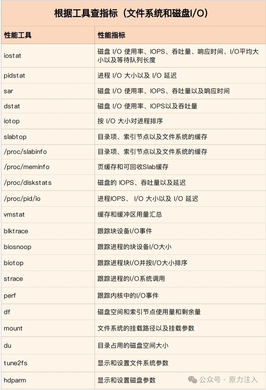 第一个维度,从文件系统和磁盘 I/O 的性能指标出发。根据不同的性能指标,对提供指标的性能工具进行分类和理解。