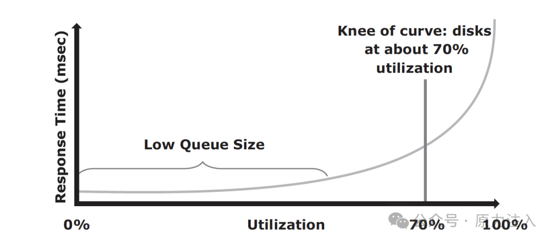 通常,在磁盘利用率达到70%之后,磁盘读写请求的延迟会出现比较明显的增大。