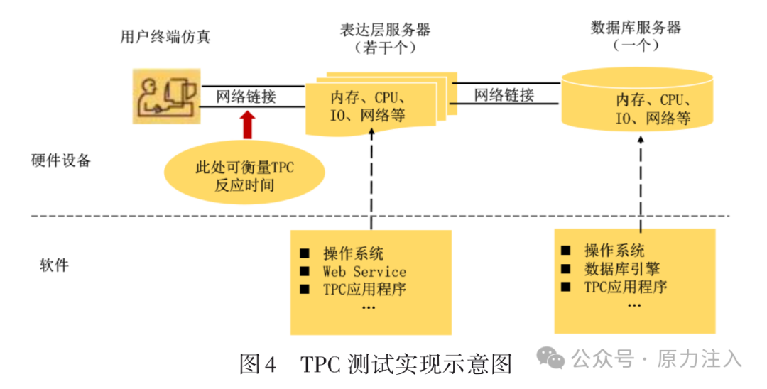 不同于SPEC从最初关注裸性能不断拓展到系统性能,TPC性能基准测试在设计之初就将系统级应用的综合性能测评作为关注的重点,测试实现方式如图4所示。20世纪80年代,事务处理模式出现。与20世纪70年代占统治地位的批量计算模式不同,事务处理模式采用相对单一的方式,直接通过在线数据库系统进行简单的事务处理。同时期,用于度量系统对该类事务处理性能的主要测试基准包括TP1(Transaction Process 1)和DebitCredit。该类测试基准由于缺少对测试执行过程和综合测评结果的有效监督,易出现测试过程不规范,甚至给出误导性测试结果的情况20世纪80年代末,第一个TPC基准TPC-A发布,对事务处理时限、测试系统终端数量等提出明确要求,澄清了当时混乱的市场,为推动 CPU 的系统级性能测试提供了重要依据。