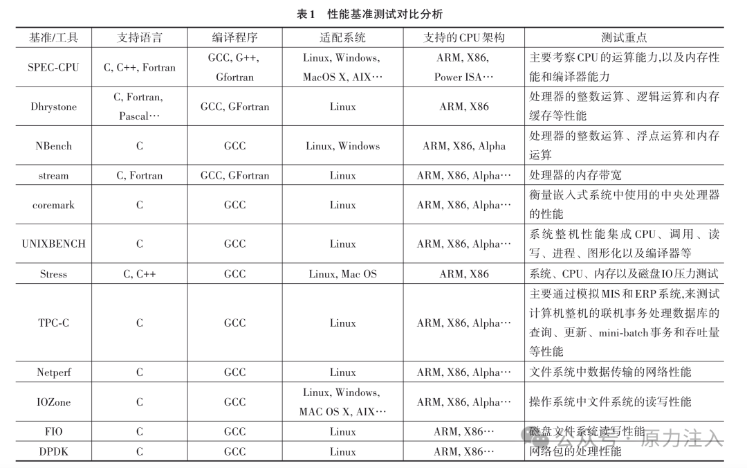 为直观地展示本文所述通用测试基准的测试重点及主要特性,各类性能基准测试及相关工具的支持语言、编译程序、适配系统、支持的CPU架构及测试侧重点信息,如表1所示。