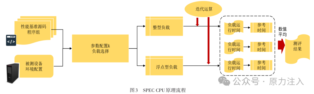 SPEC性能基准测试于1988年由标准性能评估机构SPEC提出,目前已发展成为包含CPU性能、服务器能效、文件系统性能、高性能计算、Web应用性能等在内的基准测试簇。其中SPEC CPU系列基准是公认的、具有事实性影响力的CPU性能基准测试标准,通过测试程序在被测系统和基准系统中执行时间的比值来考察系统CPU运算性能,原理如图3所示。