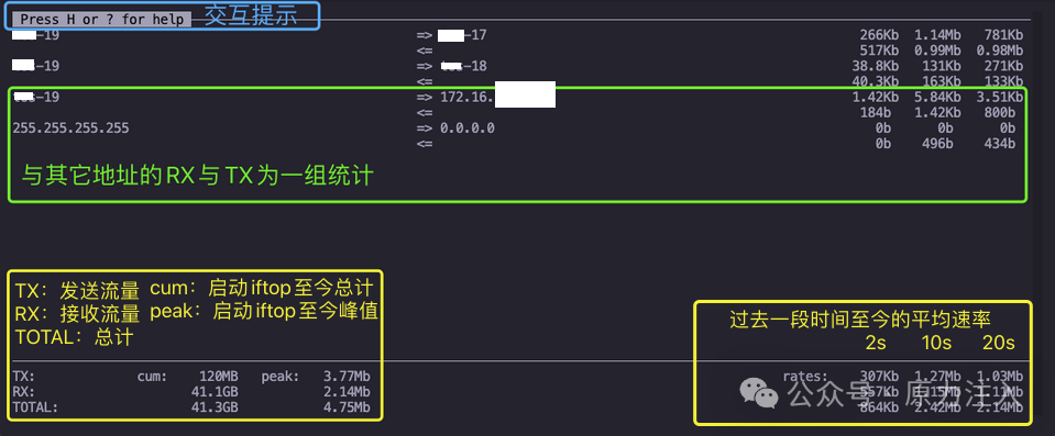 iftop参数:-i 指定需要检测的网络接口,如:# iftop -i eth1-B 将输出以byte为单位显示网卡流量,默认是bit-n 将输出的主机信息都通过IP显示,不进行DNS解析,也可以在交互界面切换-N 只显示连接端口号,不显示端口对应的服务名称-F 显示特定网段的网卡进出流量 如iftop -F 192.168.85.0/24-h 帮助,显示参数信息-p 以混杂模式运行iftop,显示所有网络流量,而不仅仅是与本机有关的流量,此时iftop可以用作网络嗅探器-P 显示主机以及端口信息-m 设置输出界面中最上面的流量刻度最大值,流量刻度分5个大段显示 如:# iftop -m 100M-f 使用筛选码选择数据包来计数 如iftop -f filter code-b 不显示流量图形条-c 指定可选的配置文件 如iftop -c config file-t 使用不带ncurses的文本界面, 以下两个是只和-t一起用的: -s num num秒后打印一次文本输出然后退出,-t -s 60组合使用,表示取60秒网络流量输出到终端 -L num 打印的行数-f 参数支持tcpdump的语法,可以使用各种过滤条件。3.2 界面说明