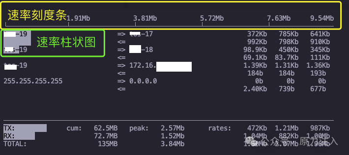 第一列:TX表示发送流量,RX表示接收流量,TOTAL表示总流量。