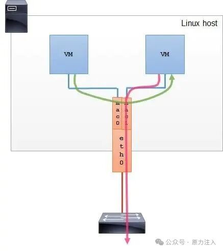 用 MACVLAN 技术虚拟出来的副本网卡,在功能上和真实的网卡是完全对等的,此时真正的物理网卡实际上确实承担着类似交换机的职责,收到数据包后,根据目标 MAC 地址判断这个包应转发给哪块副本网卡处理,由同一块物理网卡虚拟出来的副本网卡,天然处于同一个 VLAN 之中,可以直接二层通信,不需要将流量转发到外部网络。