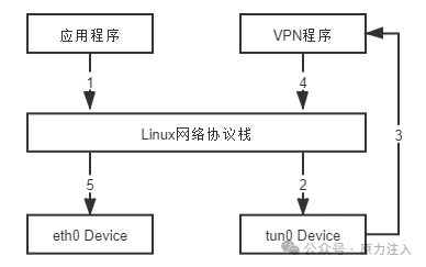 tun 和 tap 是两个相对独立的虚拟网络设备,其中 tap 模拟了以太网设备,操作二层数据包(以太帧),tun 则模拟了网络层设备,操作三层数据包(IP 报文)。使用 tun/tap 设备的目的是实现把来自协议栈的数据包先交由某个打开了/dev/net/tun字符设备的用户进程处理后,再把数据包重新发回到链路中。你可以通俗地将它理解为这块虚拟化网卡驱动一端连接着网络协议栈,另一端连接着用户态程序,而普通的网卡驱动则是一端连接网络协议栈,另一端连接着物理网卡。只要协议栈中的数据包能被用户态程序截获并加工处理,程序员就有足够的舞台空间去玩出各种花样,譬如数据压缩、流量加密、透明代理等功能都能够以此为基础来实现,以最典型的 VPN 应用程序为例,程序发送给 tun 设备的数据包,会经过如图 12-3 所示的顺序流进 VPN 程序: